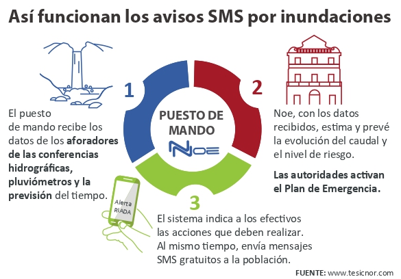 Las decisiones se toman en base a los datos que llegan al centro de mando y las predicciones de NOE, un software específico desarrollado por la empresa navarra Tesicnor. Noe recaba datos en tiempo real de los aforadores ríos (dispositivos de medición de caudal) de las confederaciones hidrográficas, de los registros pluviométricos y de la previsión meteorológica. Toda esta información combinada con los registros históricos de la base de datos ayuda a determinar en qué nivel de riesgo está la población. Y así, por un lado, emitir mensajes SMS que ayudan a la ciudadanía a tomar medidas adecuadas, alejando los vehículos de zonas inundables, por ejemplo; y por otro, a coordinar los efectivos, enviando a protección civil o policía local a acordonar e impedir el acceso a dichas zonas; según los distintos niveles de emergencia establecidos en el Plan. Es decir, facilita la toma de decisiones desde el punto de control al sugerir las medidas más adecuadas y avanzar los niveles de riesgo.